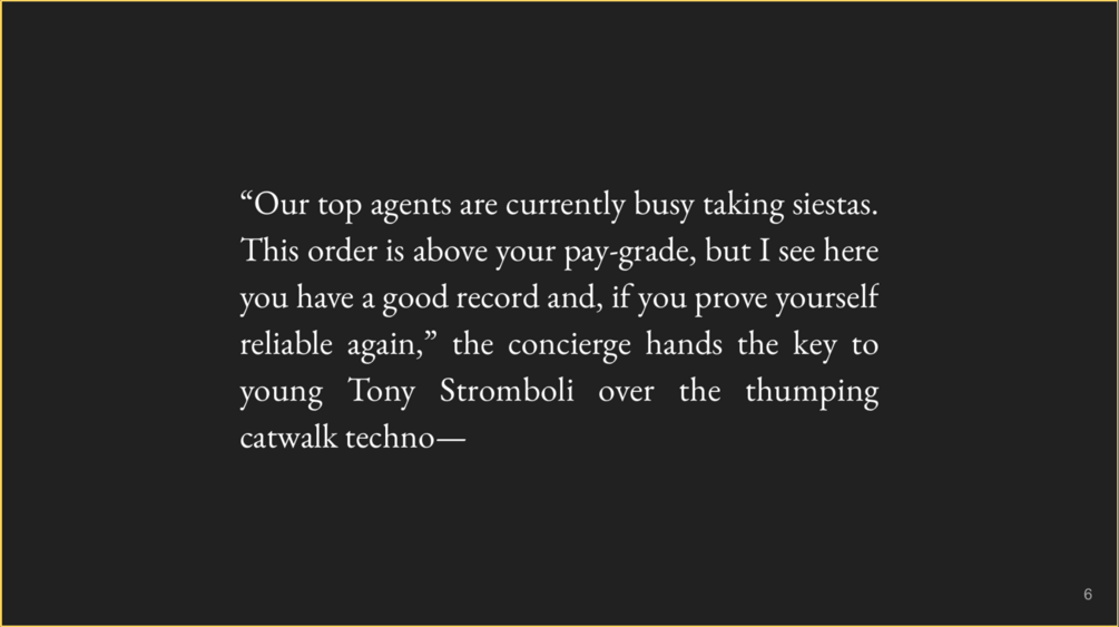 Tony Stromboli, aspiring minion at Bianco Lagiovia, an ultra high-end boutique store renowned for being the finest wedding-dressmakers in the world, sets off to deliver an order—only to finds himself embroiled in multicultural warfare and a plot tangier than ripe tomato-sauce.
